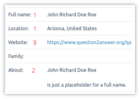 The following picture shows the form elements used for these type of profile fields. Note red numbers were added, these numbers identify the type of field in use (see above):