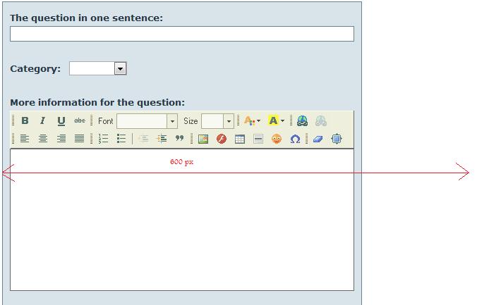 To make the text editor wider, it is in style folder - Standard form (tall version) - qa-form-tall-table. There you can make the whole thing wider.