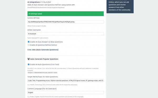 4. Strict Language Enforcement Running a non-English forum? No problem. You can configure the "Content Language" in the admin settings. The AI is strictly prompted to generate questions, auto-answers, and refinements in your target language (e.g., Spanish, French, Arabic), or it can inherit your default site language.