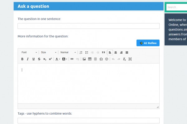 3. "AI Refine" Button for the 'Ask' Page Improve the quality of user-generated content! This feature injects a slick "✨ AI Refine" button right above the question WYSIWYG editor (CKEditor or Plain text). If a user writes a messy or poorly spelled question, they can click it, and the AI will instantly rewrite it to be professional, grammatically correct, and clear.