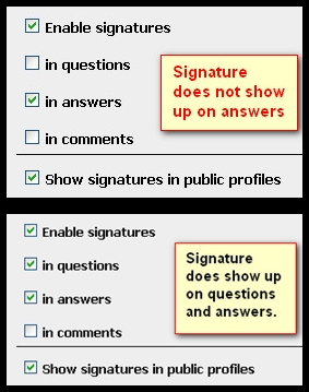 - Select Enable signatures in both questions and answers ==> signature does show up