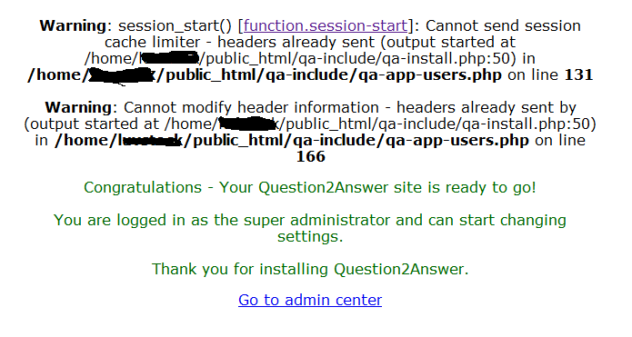 Warning: session_start() [function.session-start]: Cannot send session cache limiter - headers already sent (output started at /home/localhost/public_html/qa-include/qa-install.php:50) in/home/localhost/public_html/qa-include/qa-app-users.php on line 131