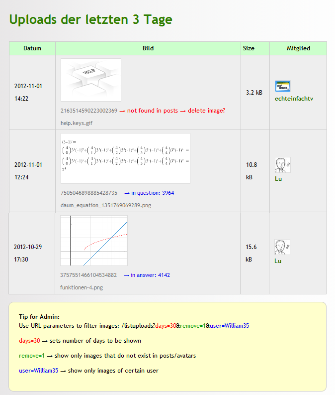 - admin can specifiy parameters by URL to filter images: /listuploads?days=30&remove=1&user=William35 (see instruction on listuploads page)