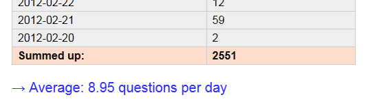echo '<p style="color:#33F;font-size:20px;">→ Average: ' . round($sum/$countDays,2) . ' questions per day</p>';