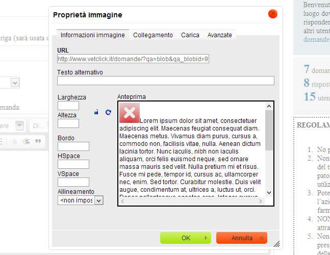 When i upload an image in Ckeditor to server, the process looks fine, but aftwer that the preview in the pop-up shows a red "x" mark with no way to see or attach the image. Following an image of the error. I believe is some permission #777 to some files but can't figure it which ones.