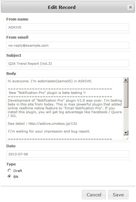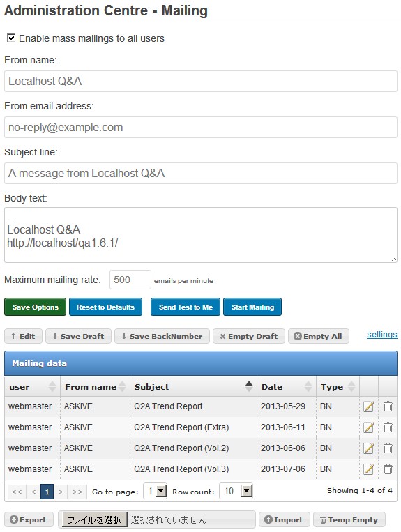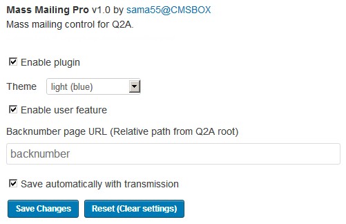 This plugin strengthens mass mailing feature of Q2A. Mass mail management to registered user becomes convenient by Ajax & CRUD-GUI dynamically and dramatically.