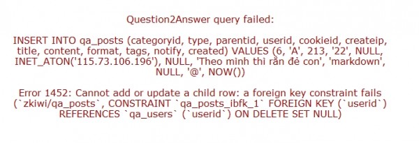 I have set up my Q2A before Wordpress web site. And i deleted all user in Q2A site(by admin account). All post be come to visitor posts. Then, i set define('QA_WORDPRESS_INTEGRATE_PATH', '../'); for Q2A site. I try registration an account in wordpress site, after login it, i go to Q2A site. User is login two site, but my new account not show in users page and can not post or do anything in Q2A site. Below is a picture for my post answer error.