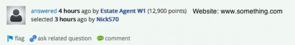 Regarding performance, the explanation is simple: this will run a quick query each time the information is requested (the query is needed even if the user has not set a website in their profile). This means if you have a question list with 20 questions then this query will be run 20 times.