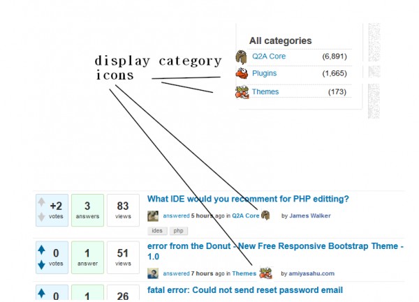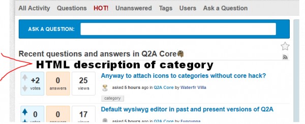 Regarding adding the category description after the category title is simpler, as you just need to override the page_title_error() in your qa-theme.php file: