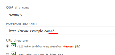 Under Preferred site URL change http://www.example.com//  to  http://www.example.com/