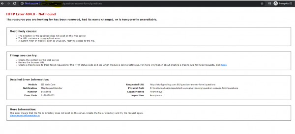 I integrated question2answer in an existing website, which is working fine on localhost, but the problem is on server. I followed the same step for server as well. The issue is when I route within question2answer it gives "HTTP Error 404.0 - Not Found" along with other details as shown in the attached snapshot below. Further I keeped question2answer folder inside main app folder. What's going wrong in the code. Need some suggestions. please.