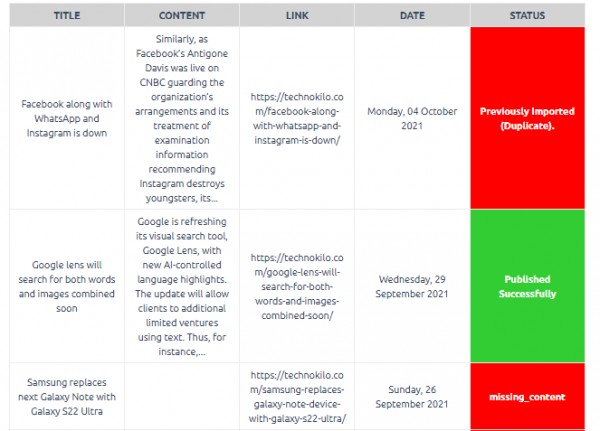 • Plugin will show results as a table output, showing if successfully published, or duplicate, or missing data