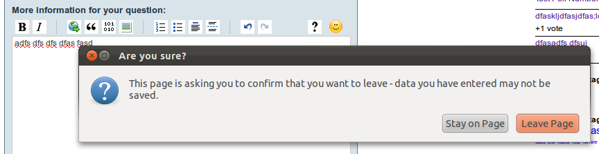 So I created a free plugin for that, check it out at: http://www.question2answer.org/qa/32331/new-free-plugin-warn-on-leave-by-q2apro-com
