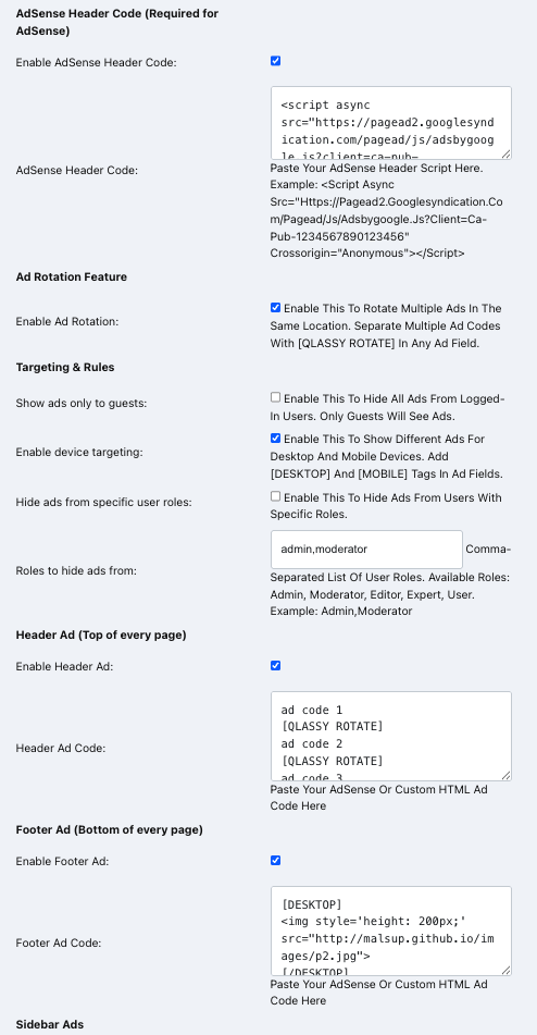 • Ad Rotation: Multiple ads with [QLASSY ROTATE] separator
