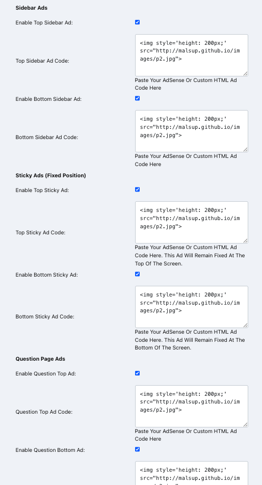 • Code Input Fields: For each ad location