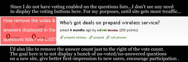 I have voting on questions "list" disabled, so that users can not vote on questions by viewing the question page first. Therefore, I'd like to do away with the vote up/down buttons and in my case also the answer count that shows to the left of the question titles in the question list pages. I'm using the Candy theme, but I imagine this mod would be applicable to CSS for any theme. Please advise. Thank you guys in advance.