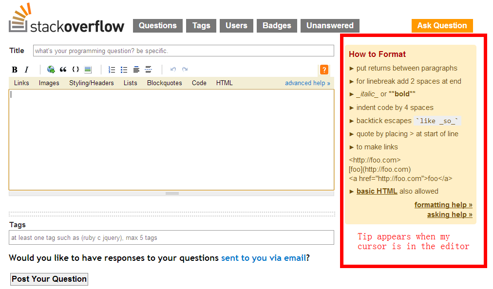 when I type in "title", it teach me how to ask; when I type in the editor ,it teach me how to format ; and I type in "tags", it teach me how to tag.