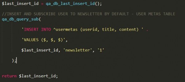 Within that function, you have to write a code to insert a user record with default newsletter status of '1' to the usermetas table immediately after the if-else conditions for inserting their data into the users table.