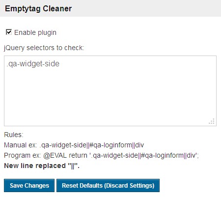 This is tiny tool plugin for removing empty HTML tag. This plugin removes also HTML tag including white-space and new-line in text-node as empty tag. Although empty tag can be erased by CSS, "empty" pseudo class of CSS3 does not work effectively, when the text node of tag has whitespace or newline. This plugin deletes empty tag, after removing whitespace and newline of tag which were specified in option by jQuery.