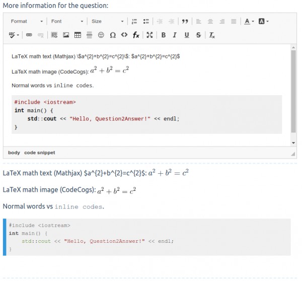 I'd like to recommend my custom CKEditor https://github.com/tangruize/q2a-formatter. Forked from arjunsuresh/mathjax and fixed code highlight bug.
