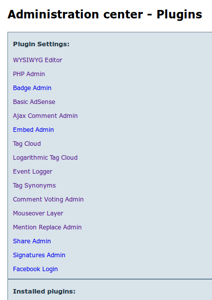 It would be nice (because I'm lazy) to have links at the top of the admin/plugins page that link to each plugin. This is because I now have 16 boxes, including the mammoth badge box. It's a bit of a chore to find the right box, so I hacked it to give me links at the top: